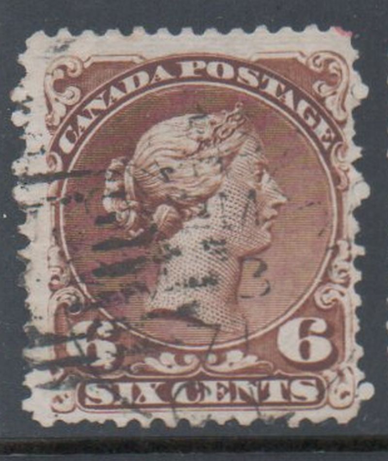 Canada Scott & Unitrade Catalogue number 27a 1868 6 cent yellow brown large Queen Victoria stamp .