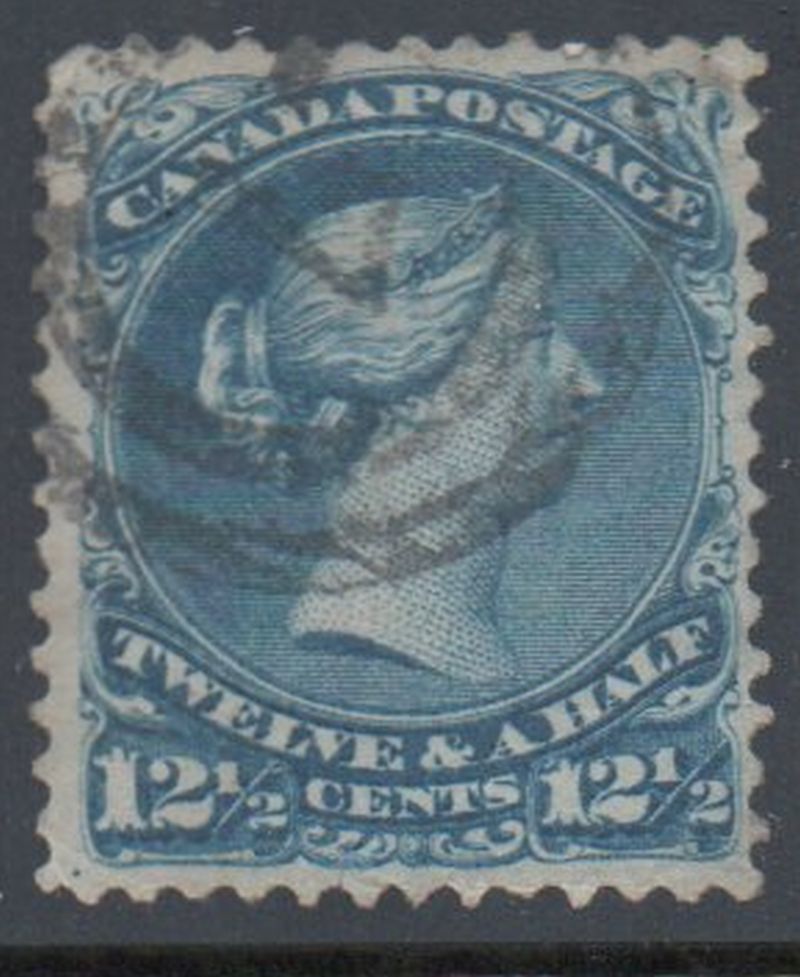 Canada Scott & Unitrade Catalogue number 28 1868 12 1/2 cent blue  large Queen Victoria stamp .Used, very good to fine, 2 ring cancel, perhaps 7? Member Canadian Stamp Dealers Association .Canadian Customers - I pay the GST/HST on your purchases from me .25-8-104.jpg