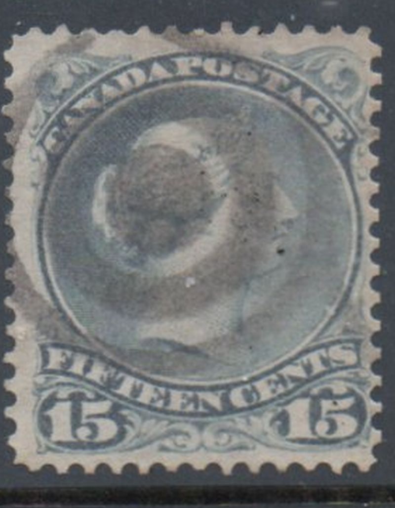 Canada Scott & Unitrade Catalogue number  15 cent gray   large Queen Victoria stamp .Used, very good to fine, bulls eye cancel .Member Canadian Stamp Dealers Association .Canadian Customers - I pay the GST/HST on your purchases from me .25-8-106.jpg
