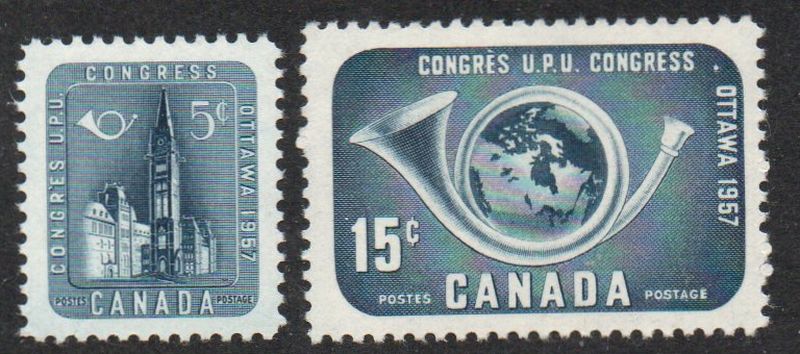 Canada Scott & Unitrade Specialized Catalogue number 371-372 1957 Universal Postal Union Congress stamp set .Mint, fine to very fine , original gum never hinged .Member Canadian Stamp Dealers Association .Canadian Customers - I pay the GST/HST on your purchases from me .