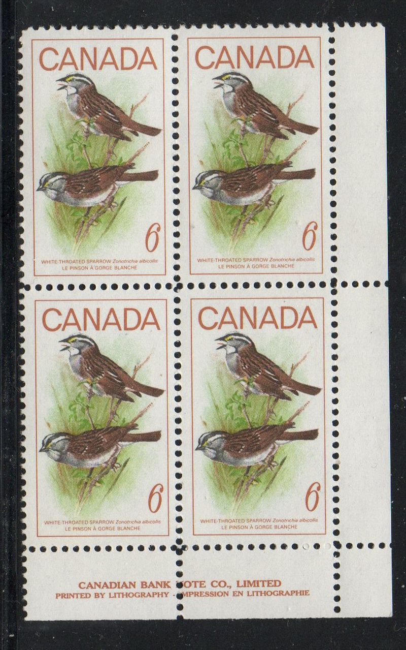 Canada Scott & Unitrade Specialized Catalogue number 496 1969 6 cent Sparrow Inscription Block of 4 Lower Right.
