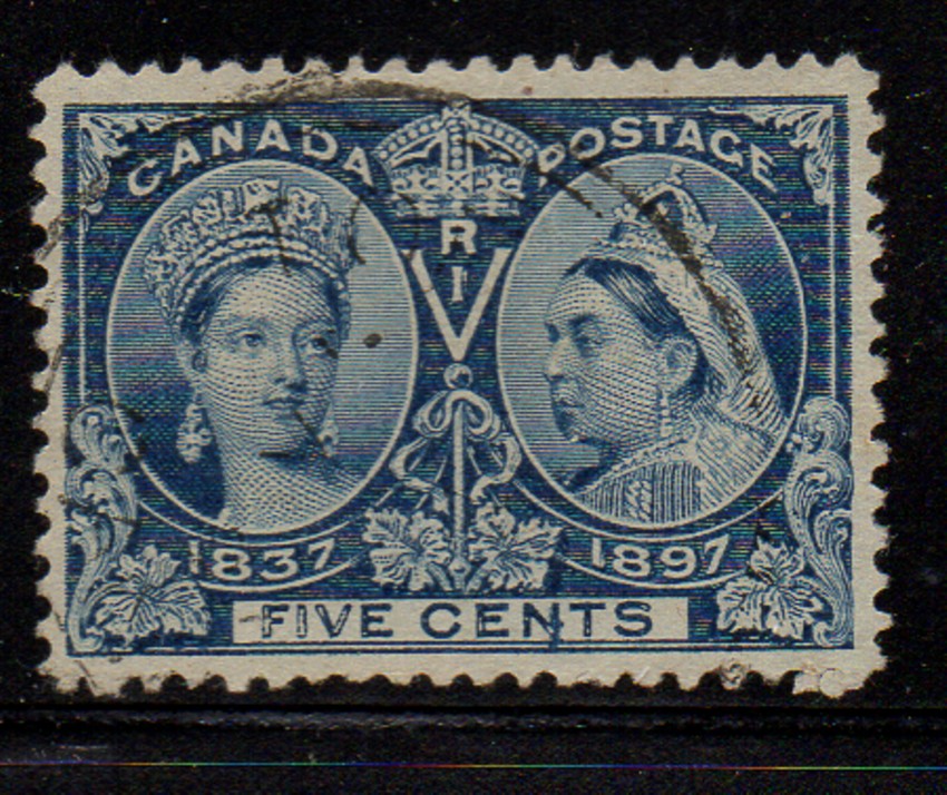 Canada Scott & Unitrade Catalogue number 54 1897 5 cent deep blue Victoria Jubilee issue stamp.Used, fine to very fine .Member Canadian Stamp Dealers AssociationCanadian Customers - I pay the GST/HST on your purchases from me .15-9-61.jpg