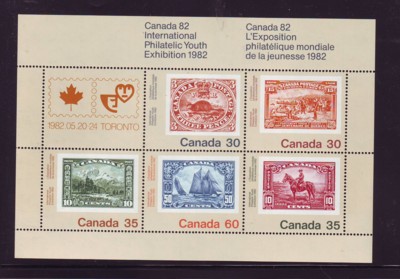 Canada Scott Catalogue number 913a 1982 International Philatelic Youth Exhibition stamp souvenir sheet .Mint, fine to very fine, original gum never hinged.Member Canadian Stamp Dealers Association . Canadian Customers - I pay the GST/HST on your purchases from me .