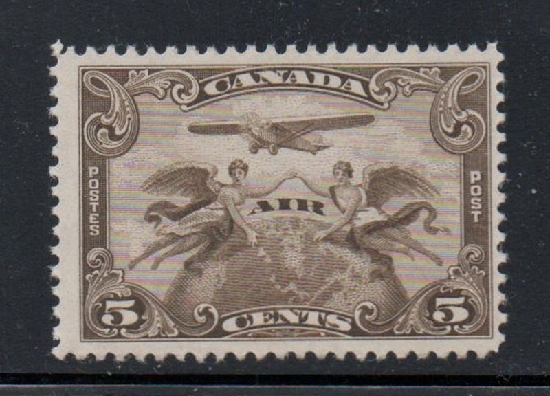Canada Scott & Untrade Specialized Catalogue C1 1928 5 cent brown olive Airplane circling Globe airmail stamp .