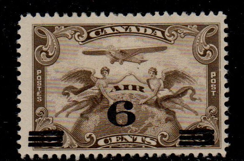 Canada Scott & Unitrade Catalogue number C3 1932 6 ceny overprint on 5 cent aiplane over globe airmail stamp .Mint,  fine original gum hinged  .Member Canadian Stamp Dealers AssociationFree shipping on purchases over $50 going to North America .Canadian Customers - I pay the GST/HSt on your purchases from me .24-10-44.jpg