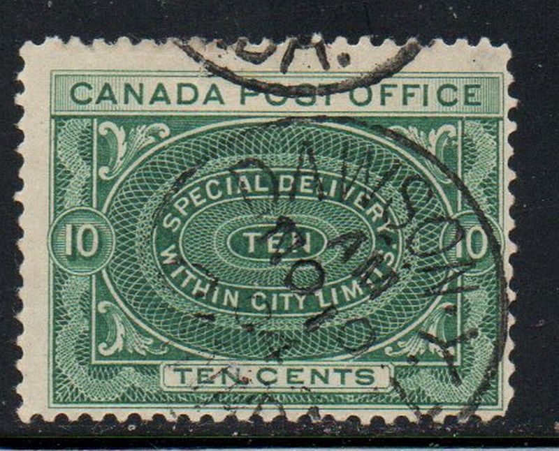 Canada Scott& Unitrade Catalogue number  E 1 1898 10 cent blue green Special Delivery stamp .Used, very good to fine Dawson Y. T. cancel.Member Canadian Stamp Dealers AssociationCanadian Customers - I pay the GST/HSt on your purchases from me .25-10-19.jpg
