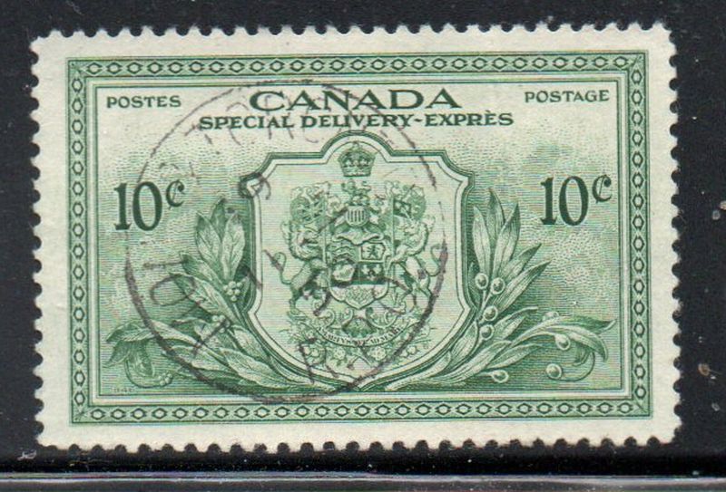 Canada Scott & Unitrade Catalogue number E11 1946 10 cent special delivery stamp .Used, fine to very fine .Member Canadian Stamp Dealers Association .Canadian Customers - I pay the GST/HST on your purchases from me .25-6-59.jpg