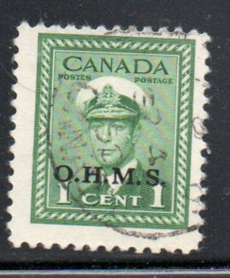 Canada Scott & Unitrade Catalogue number O1 1942 1 cent green George VI stamp with O.H.M.S. overprint for official used