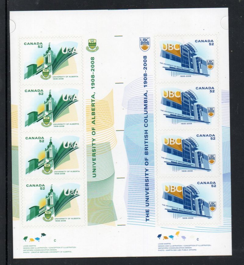Canada Scott & Unitrade Catalogue number 2265b, 2008 52 cent University of Alberta & University of British Columbia self adhesive stamp booklet pane of 4 each with gutter between.Mint, fine to very fine, original gum never hinged .Member Canadian Stamp Dealers AssociationCanadian Customers - No added GST/HST .US customers - There is no tariff on postage stamps that I send to you.