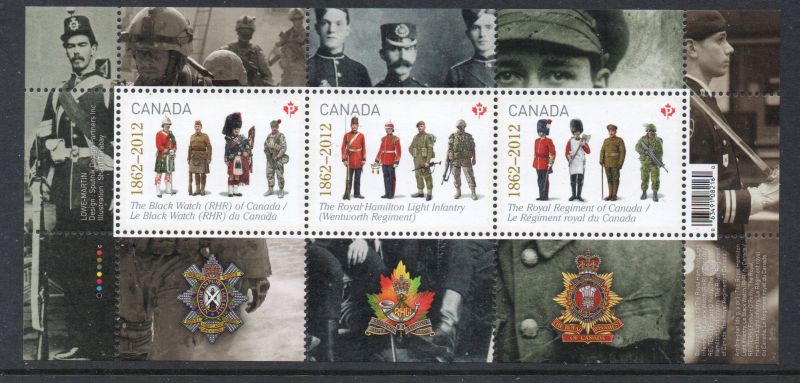 Canada Scott  & Unitrade Specialized Catalogue number 2577 2012 Regiments stamp souvenir sheet .Mint, fine to very fine, original gum never hinged  .Member Canadian Stamp Dealers AssociationCanadian Customers - No added GST/HST .US customers - There is no tariff on postage stamps that I send to you.