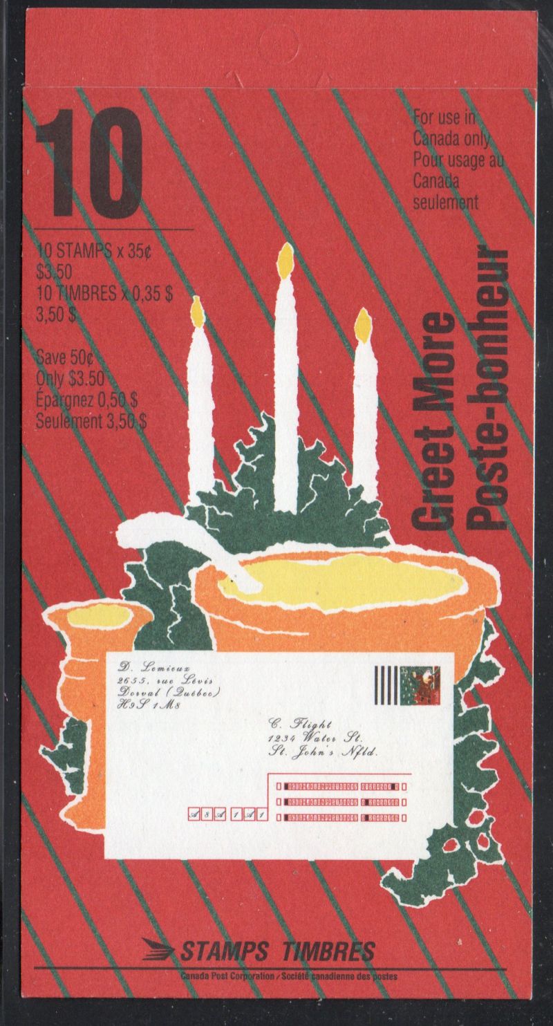 Canada Unitrade Catalogue number BK133b 1991 35 c Greet More Christmas stamp ( Sc 1342aa) stamp booklet of 10 open cover Tab Inscription .