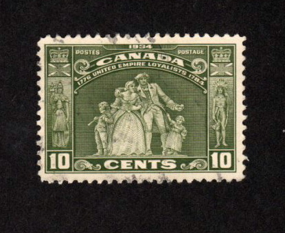 This lot contains a used VF 10 cent olive green Loyalists stamp. This stamp is Scott # 209 issued July 1 1934.