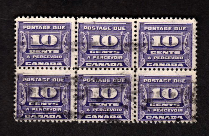 This lot contains a used block of 6 10 cent dark violet Postage Due stamps Scott # J14 issued December 20 1933.
