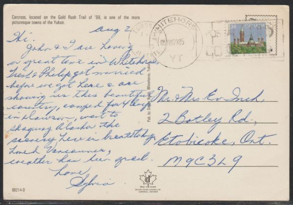 A ChromeEra colour postcard showing Carcross, Yukon Territory, used 1985 Whitehorse to Etobicoke, Ont some light corner bendsCanadian buyers - I pay the GST/HST for you.