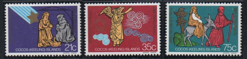 Cocos ( Keeling) Islands Scott Catalogue number 104-106 1982 Christmas stamp set .Mint, fine to very fine, original gum never hinged .Member Canadian Stamp Dealers Association .Canadian Customers - I pay the GST/HST on your purchases from me .