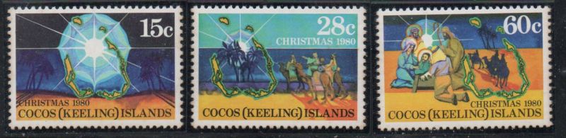 Cocos ( Keeling) Islands Scott Catalogue number53-55 1980 Christmas stamp set .Mint, fine to very fine, original gum never hinged .Member Canadian Stamp Dealers Association .Canadian Customers - I pay the GST/HST on your purchases from me .