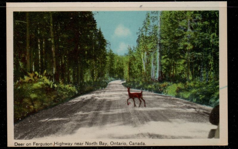 Colour linen era Postcard Deer on Ferguson Highway near North Bay, Ontario unused .Member Canadian Stamp Dealers Association .Canadian Customers - I pay the GST/HST on your purchases from me .sc25-1-9.jpg