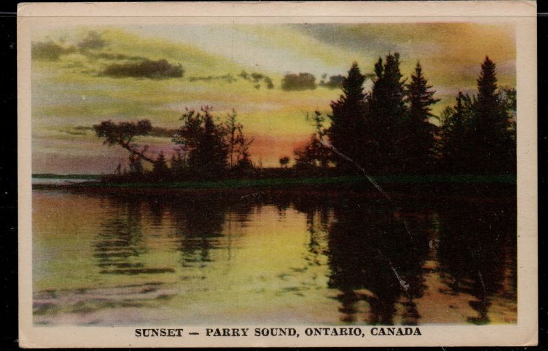 Colour linen eraKrom-O -Graph Postcard Sunset, Parry Sound, Ontario, unused .Member Canadian Stamp Dealers Association .Canadian Customers - No added GST/HST on your purchases from me .US customers - No tariffs on stamps and postcard .sc25-1-8.jpg