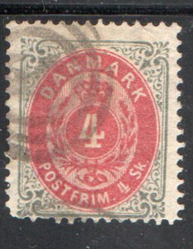 Denmark Scott Catalogue number 18 1870 4 sk gray & carmine Royal Emblems stamp