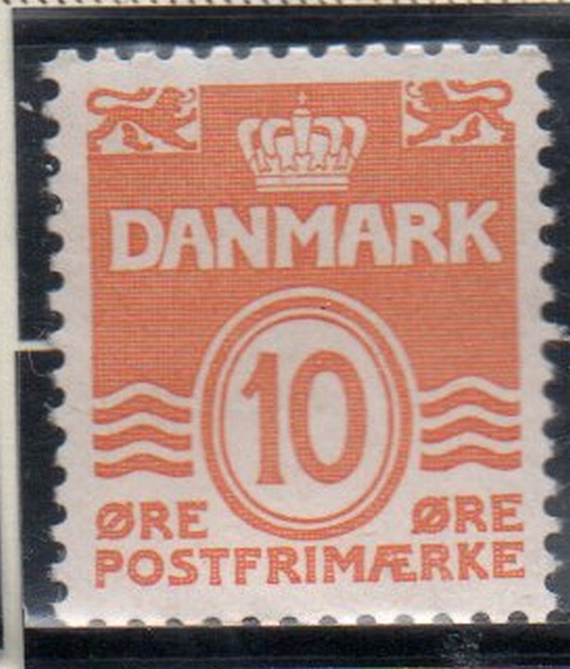 Denmark Scott Catalogue number 228 1933 10 ore yellow wavy lines stamp .Mint, fine to very fine, original gum hinged.Canadian Customers - I pay the GST/HST for youMember Canadian Stamp Dealers Association .