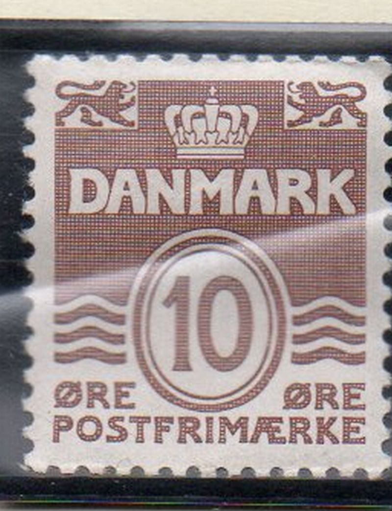 Denmark Scott Catalogue number 229 1937 10 ore light brown wavy lines stamp .Mint, fine to very fine, original gum hinged.Canadian Customers - I pay the GST/HST for youMember Canadian Stamp Dealers Association .