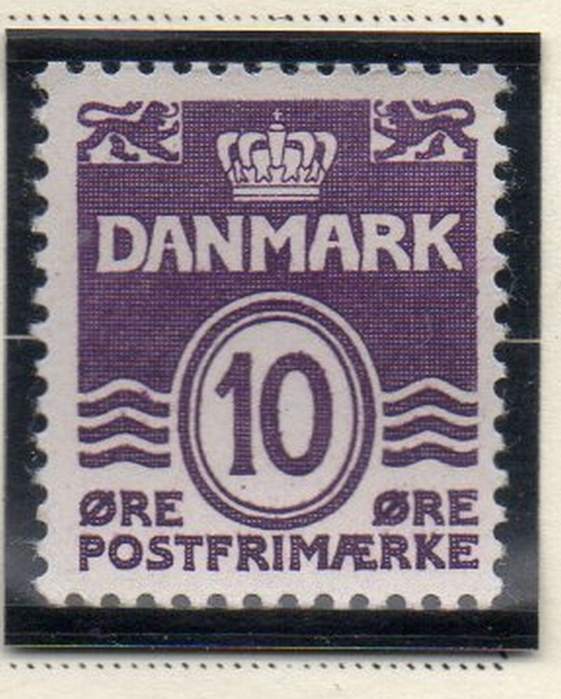 Denmark Scott Catalogue number 230 1938 10 ore violet wavy lines stamp .Mint, fine to very fine, original gum hinged.Canadian Customers - I pay the GST/HST for youMember Canadian Stamp Dealers Association .