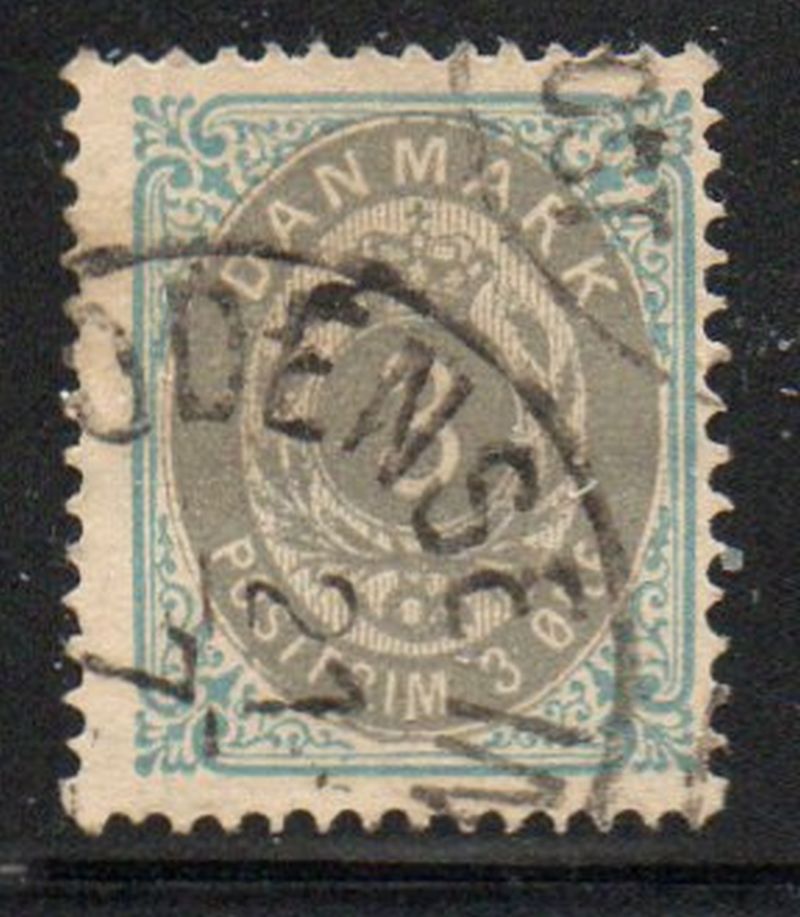 Denmark Scott Catalogue number 25 1875 3 ore  gray blue & gray  Royal Emblems stampUsed, fine .Canadian Customers - I pay the GST/HST for youMember Canadian Stamp Dealers Association .Free shipping on orders over $50 going to Canada and the USA .24-6-6.jpg
