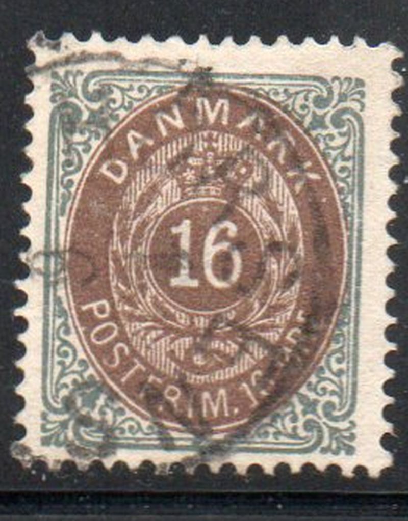 Denmark Scott Catalogue number 30 1875 16 ore slate & brown  Royal Emblems stampUsed, fine .Canadian Customers - I pay the GST/HST for youMember Canadian Stamp Dealers Association .Free shipping on orders over $50 going to Canada and the USA .25-5-3.jpg
