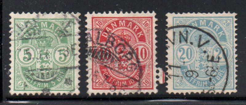 Denmark Scott Catalogue number 38-40 1884-1888  Royal Emblems stamp setUsed, fine to very fine.Canadian Customers - I pay the GST/HST for youMember Canadian Stamp Dealers Association .Free shipping on orders over $50 going to Canada and the USA .25-6-31.jpg