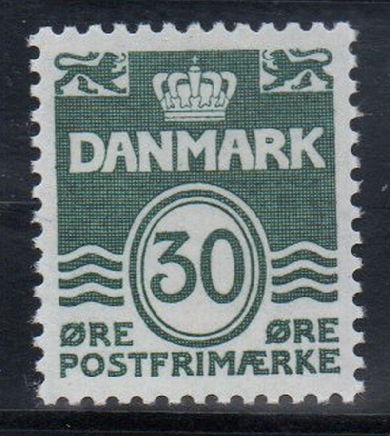 Denmark Scott Catalogue number 437 1967 30 ore deep green wavy lines stamp .Mint, fine to very fine, original gum hinged .Member Canadian Stamp Dealers Association .Canadian Customers - I pay the GST/HST on your purchases from me .
