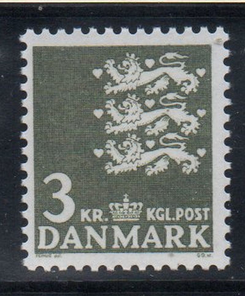 Denmark Scott Catalogue number 444A 1969 3.0 kr dark slate green 3 lions stamp .Mint, fine to very fine, original gum hinged .Member Canadian Stamp Dealers Association .Canadian Customers - I pay the GST/HST on your purchases from me .