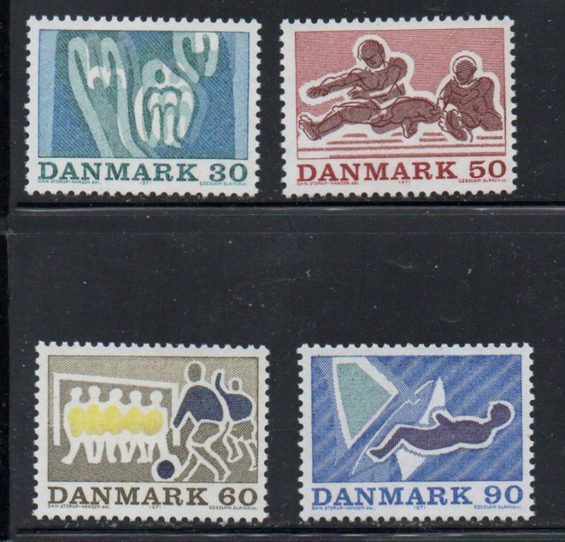 Denmark Scott Catalogue number 481-485 1971 Sports stamp set .Mint, fine to very fine original gum never hinged.Canadian Customers - no added GST/HSTUS customers - No tariffs on stamps sent by meMember Canadian Stamp Dealers Association