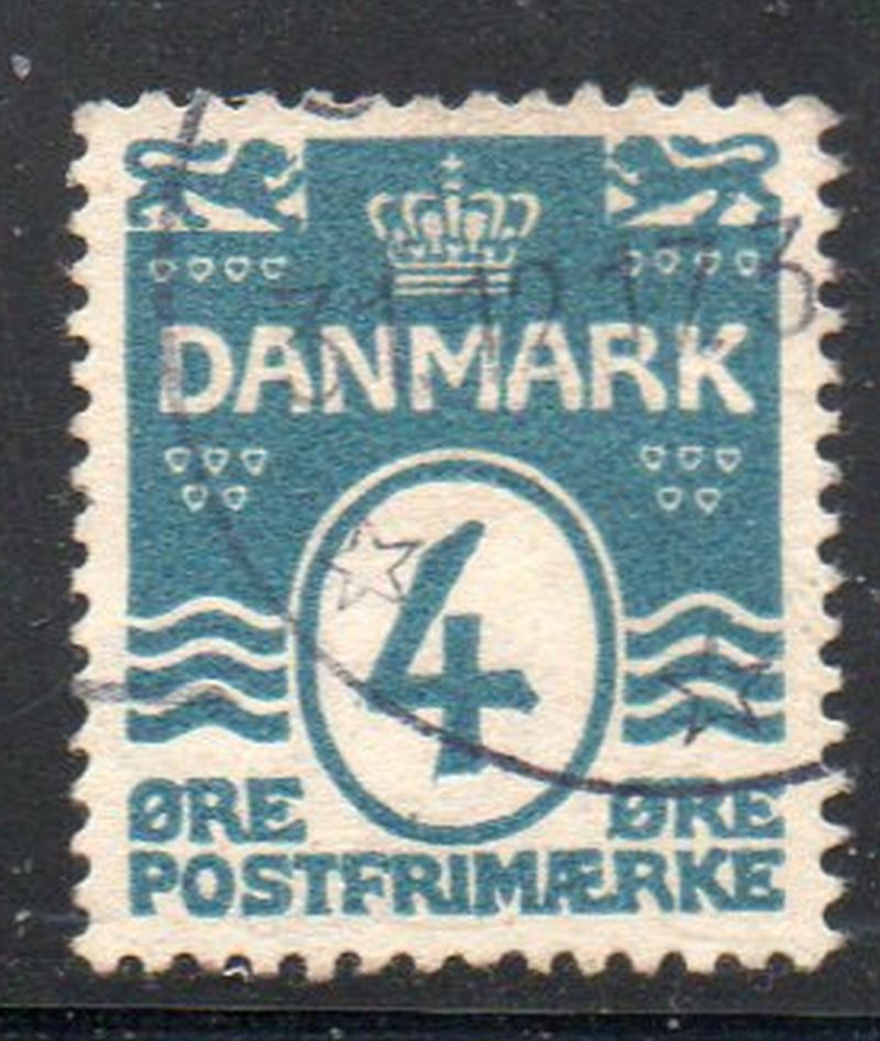 Denmark Scott Catalogue number 60a 1917 4 ore wavy lines stamp perforated 14 x 14 1/2Used, fine .Canadian Customers - I pay the GST/HST for youMember Canadian Stamp Dealers Association .Free shipping on orders over $50 going to Canada and the USA .24-5-4.jpg