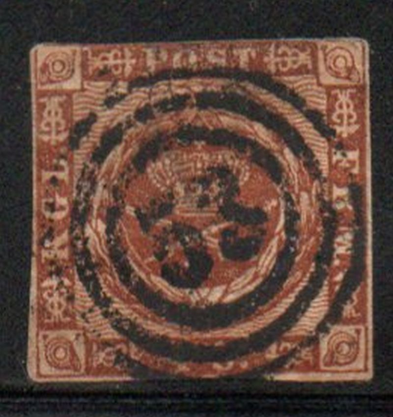 Denmark Scott Catalogue number 7 1858 4sk yellow  brown Royal Emblems stamp imperforateUsed, close margins, 3 ring cancel #53 cancelCanadian Customers - I pay the GST/HST for youMember Canadian Stamp Dealers Association .Free shipping on orders over $50 going to Canada and the USA .24-6-2.jpg
