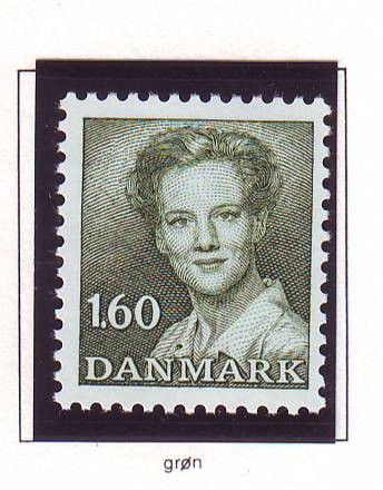 Denmark Scott Catalogue number 701 1982 1.6 kr dark olive green Queen Margrethe stamp .Mint, fine to very fine, original gum never hinged.Canadian Customers - I pay the GST/HST for youMember Canadian Stamp Dealers Association .