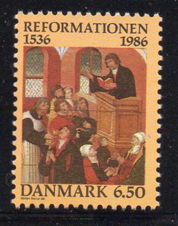 Denmark Scott Catalogue number 830 1986 450th Anniversary Protestant Reformation stamp .Mint, fine to very fine original gum never hinged.Canadian Customers - no added GST/HSTUS customers - No tariffs on stamps sent by meMember Canadian Stamp Dealers Association