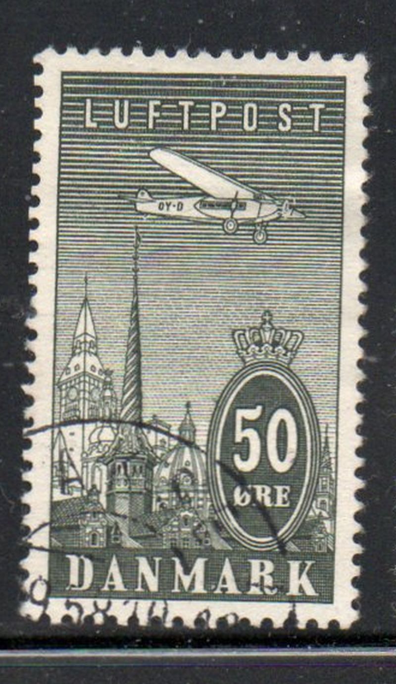 Denmark Scott Catalogue number C9 1934 50 ore Airplane over Copenhagen stamp .