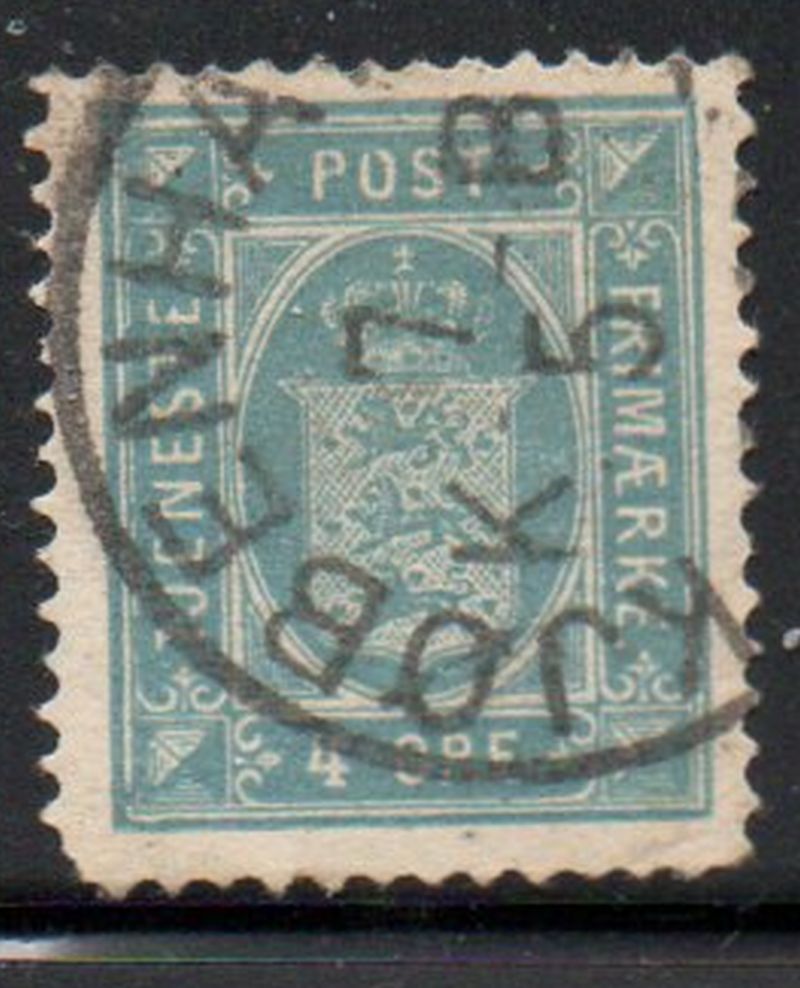 Denmark Scott Catalogue number)7 1875 4 ore greenish blue State Seal official stamp .
