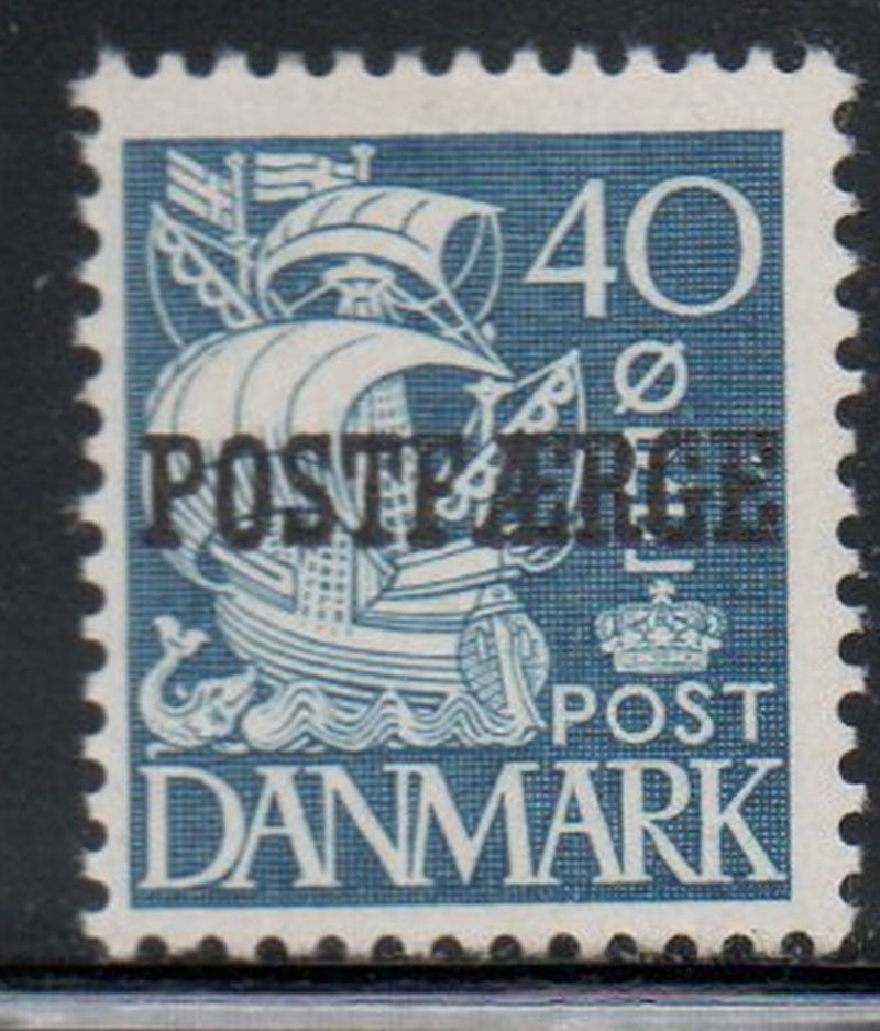 Denmark Scott Catalogue number Q25 1942 40 ore blue Caravel with "POSTFAERGE" overprint for Ferry parcel stamp use .Mint, fine , original gum hinged .Member Canadian Stamp Dealers Association .Canadian Customers - I pay the GST/HST on your purchases from me .25-9-4.jpg