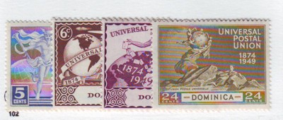 Dominica Scott  Catalogue number 116-119 1949 75th Anniversary Universal Postal Union stamp set.Mint, fine to very fine, original gum hinged . Member Canadian Stamp Dealers Association . Canadian Customers - I pay the GST/HST on your purchases from me . For more fine stamps visit the Fatdane's online stamp store8-8-6.jpg