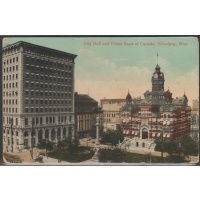 A early Valentine & Sons colour postcard showing City Hall and Union Bank Building, Winnipeg, used in Edward VII era to Milverton Ontario but no date showing on any of the postmarks, one possible part RPO cancel at bottom right. Bit of edge wear.Canadian buyers - I pay the GST/HST for you.