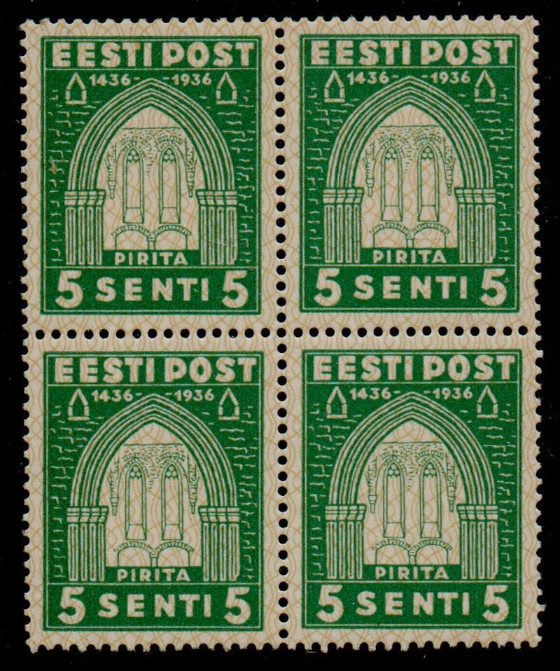 Estonia Scott Catalogue number 134 1936 5 s St Brigitta Convent stamp block of 4 .Mint, fine to very fine, original gum never hinged .Member Canadian Stamp Dealers AssociationCanadian Customers - I pay the GST/HST for you22-10-49.jpg