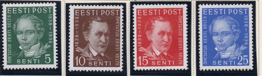 Estonia Scott Catalogue number 139-142 1938 100th Anniversary Society of Estonian Scholars stamp set.Mint, fine to very fine original gum hinged .Canadian Customers - I pay the GST/HST on your purchases from me .19-7-78.jpg