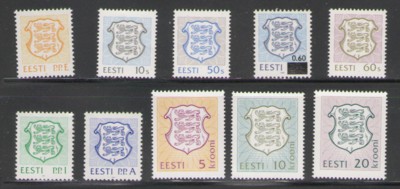 Estonia Scott Catalogue number 214-223 1992 National Coat of Arms stamp set .Mint, fine to very fine original gum never hinged .Member Canadian Stamp Dealers Association .Canadian Customers - I pay the GST/HST on your purchases from me .
