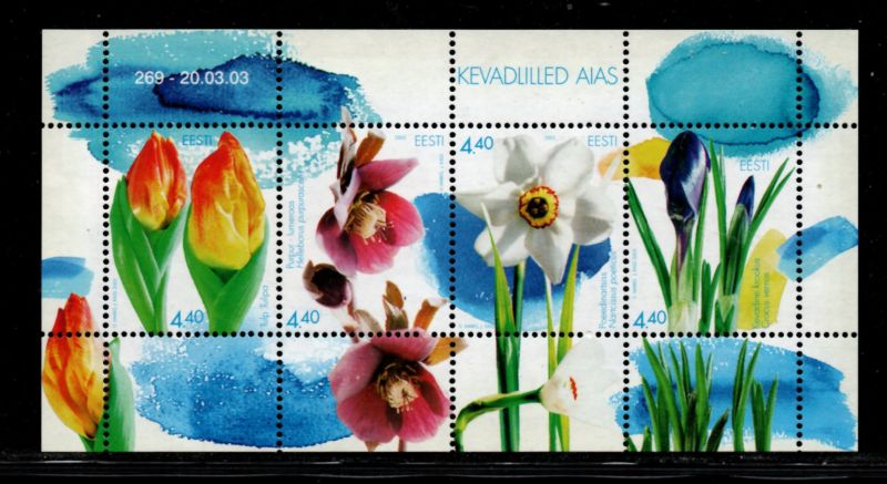 Estonia  Scott Catalogue number 455 2003 Spring Flowers  stamp sheet.Mint, fine to very fine original gum never hinged  .Member Canadian Stamp Dealers AssociationCanadian Customers - No added GST/HST .US customers - There is no tariff on postage stamps that I send to you.