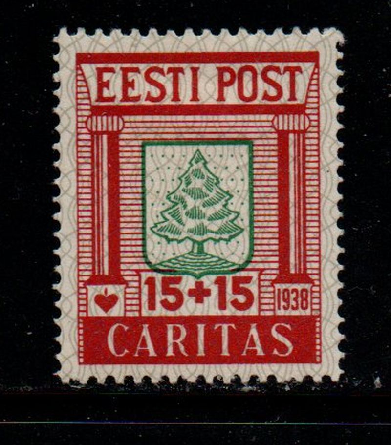 Estonia Scott catalogue number B37 1938 15 + 15 Arms of Voru charity stamp .Mint, fine original gum hinged.Canadian Customers - I pay the GST/HST for youMember Canadian Stamp Dealers Association22-5-4.jpg