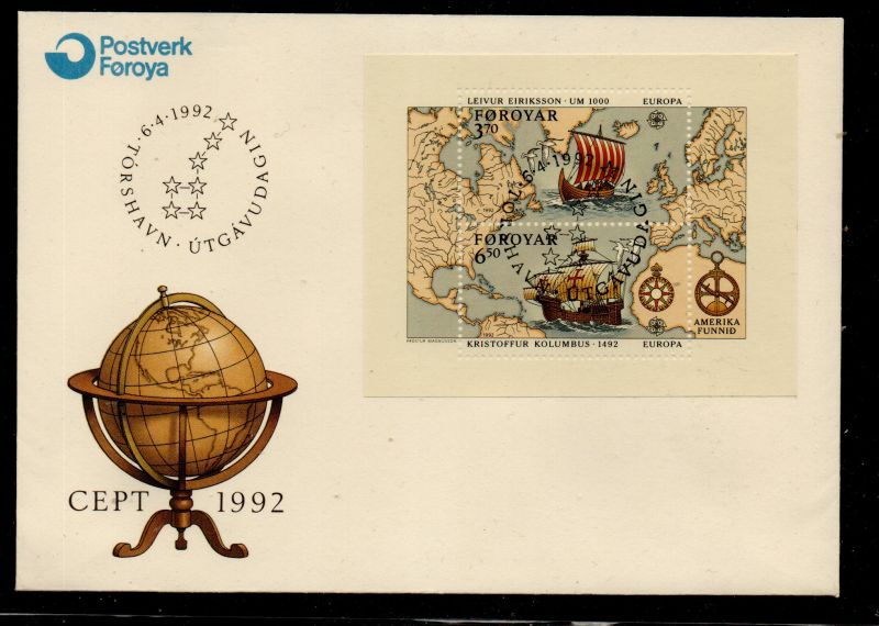 Faroe Islands Scott Catalogue number 238 1992 Colubus & Eriksson stamp souvenir sheet .