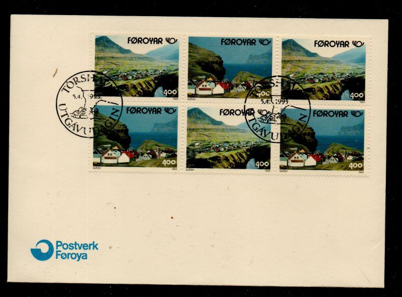Faroe Islands  Scott Catalogue number 251a 1993  Village of Gjovg  stamp booklet pane .Used on First Day Cover, fine to very fine .Member Canadian Stamp Dealers Association .Free Shipping on purchases over $50 going to North America.Canadian Customers - I pay the GST/HST on your purchases from me .22-8-61.jpg