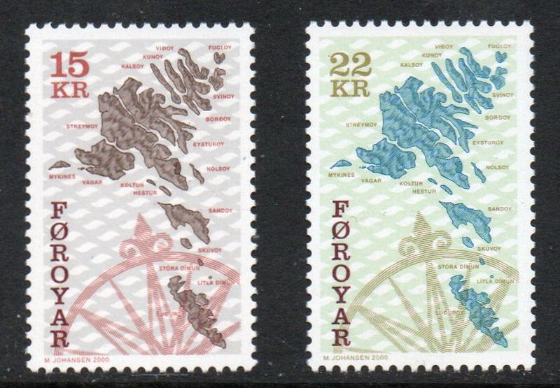 Faroe Islands Scott 377-378 2000 Maps stamp set .Mint, fine to very fine original gum never hinged .Member Canadian Stamp Dealers Association .