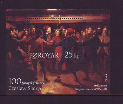 Faroe Islands Scott Catalogue number 438 2003 Krause Painting 100th Faore stamp engraved by Czeslaw Slania stamp souvenir sheet. Used, fine to very fine .